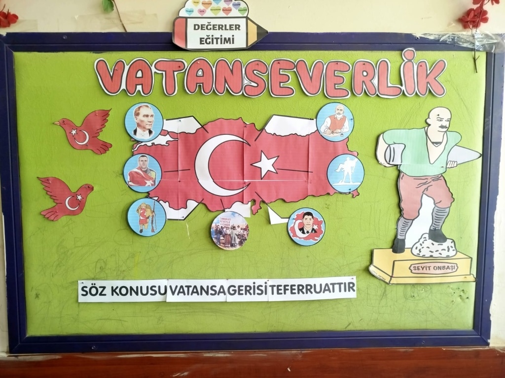 İnsanın doğduğu ve büyüdüğü topraklara, orada yaşayan insanlara duyduğu sevgi ve saygı dolayısyla ortaya çıkan duyguya vatanseverlik denir. Kişinin vatanını ve milletini sevmesi en büyük erdemdir. Kişiler vatanseverlik duygusu sayesinde gerektiği zaman vatanları için ölmeye hazırdır. Bizde öğrencilerimize vatanseverlik duygusu kazandırmak amacıyla sınıf rehber öğretmenlerimizle vatanseverlik etkinlikleri, videoları ve panoları hazırlamakta ve izlettirmekteyiz.