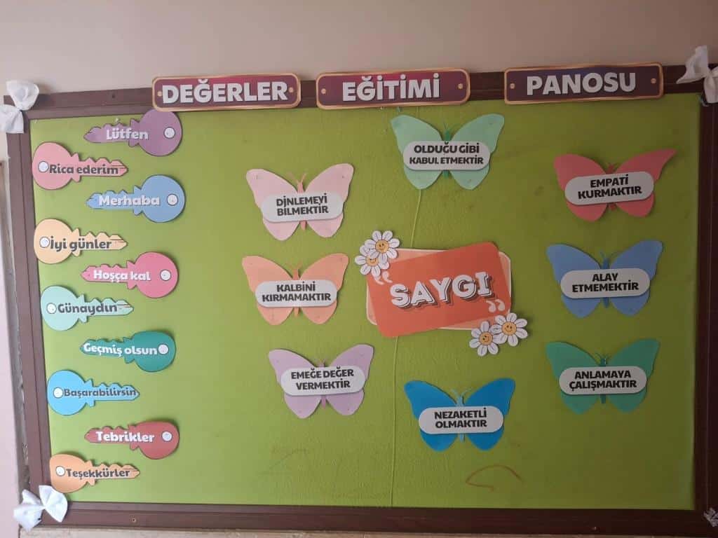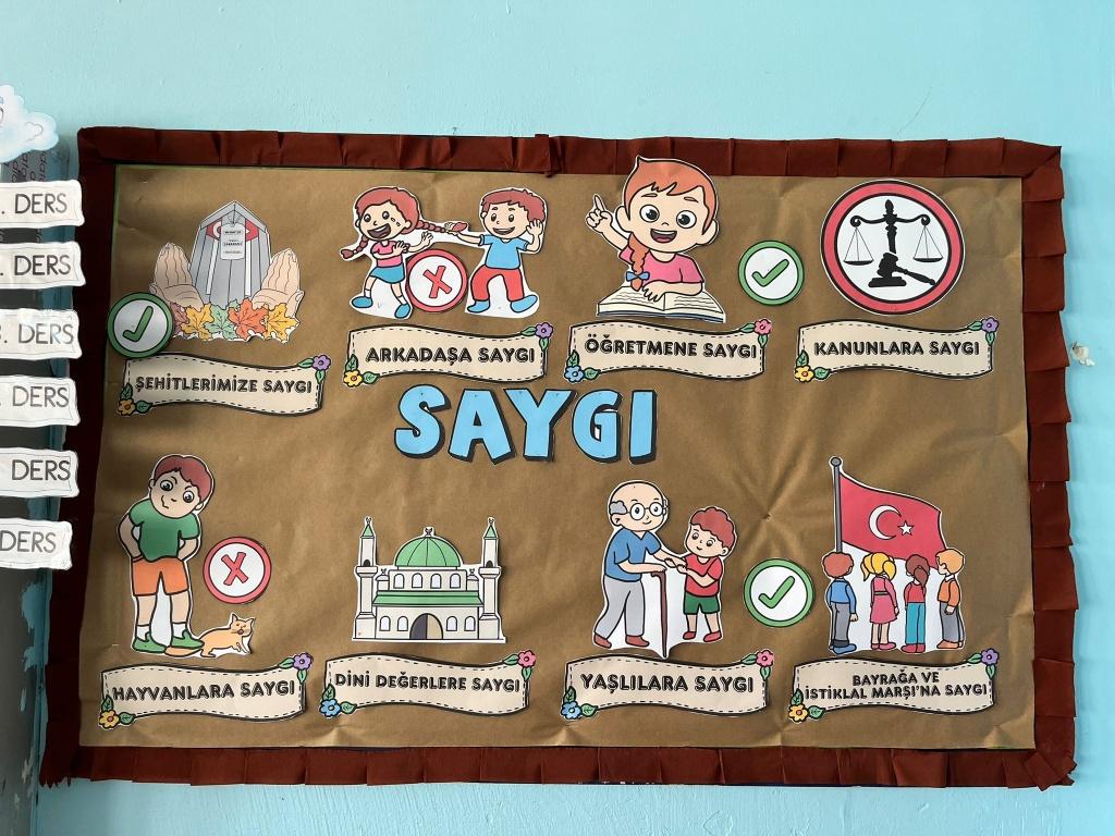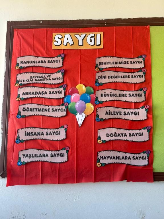 Saygı, insan ilişkilerinin temelini oluşturur. Karşımızdakini dinlemek , fikirlerine değer vermek ve empati kurmak saygının en güzel göstergelerindendir. 2025-2026 eğitim öğretim yılına saygı değerinin işlenmesiyle başladık. Öğrencilerimizde farkındalık yaratması adına sınıflarımızda ve okulumuzda saygı panasu hazırladık. Sınıf içi etkinliklerde saygı değeri Ekim ayı boyunca öğrencilerimize aktarmaya devam edeceğiz.